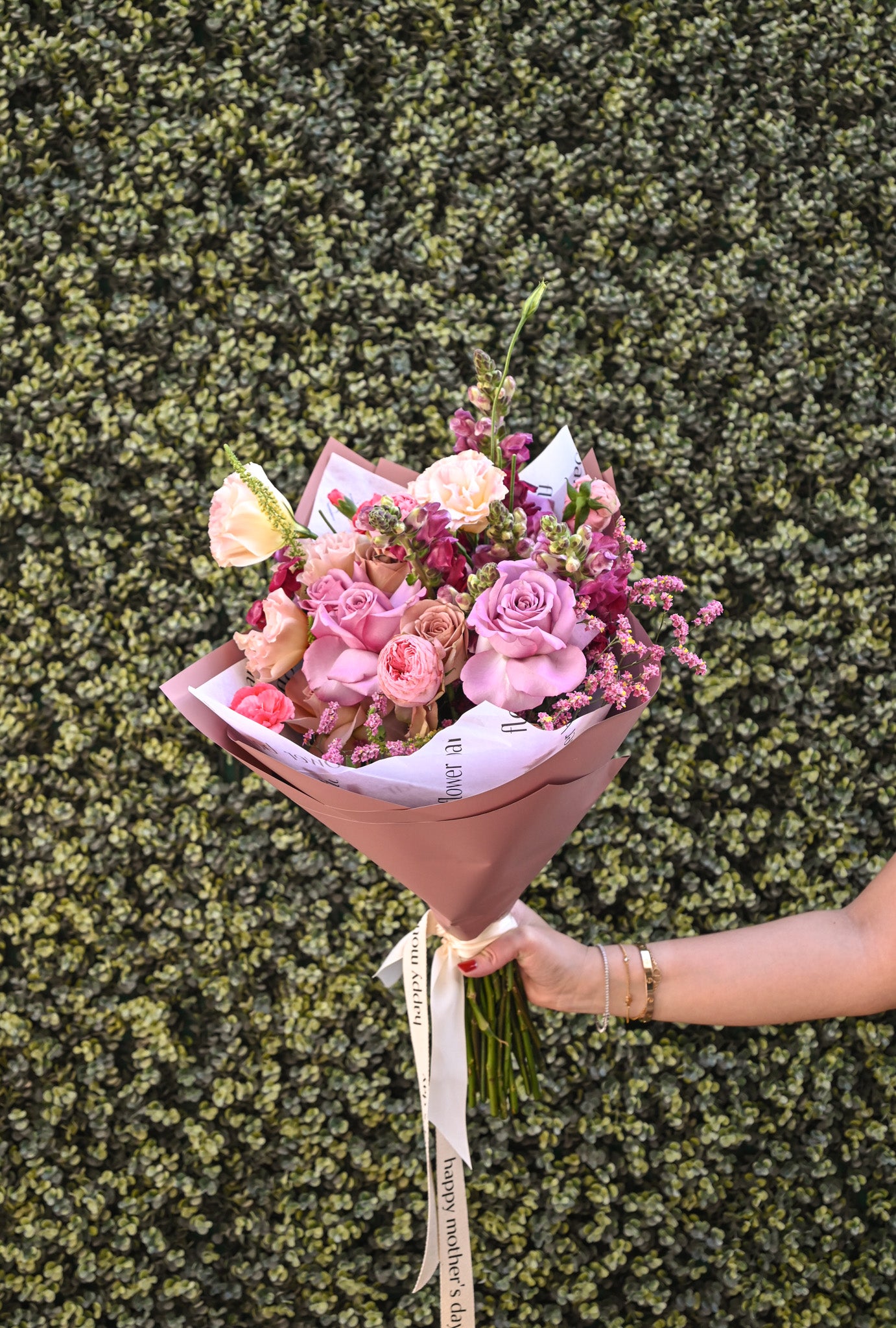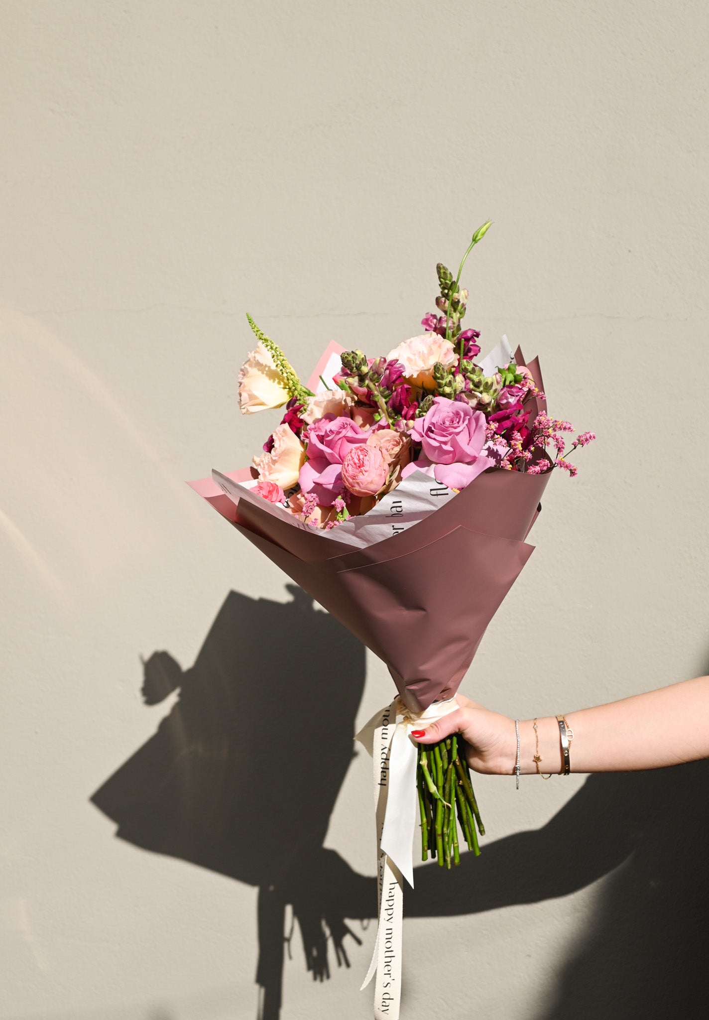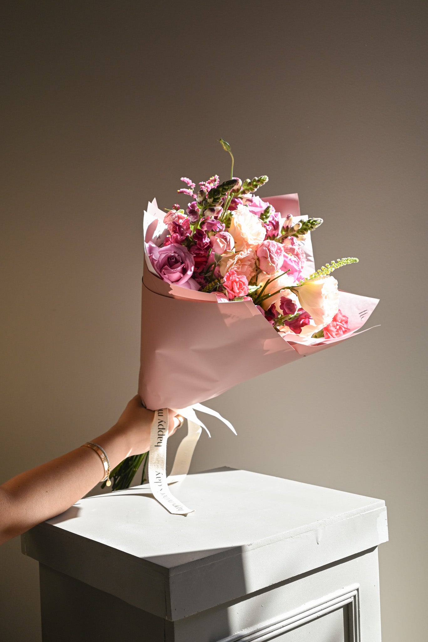 Ramo combinado floral en tonos rosados con lisianthus, rosas, rosas inglesas, astromelias y perrito
